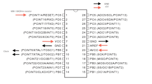 | 1x 28 Pin DIP socket PRT-07942 – helpful for reprogramming the chip so that you don’t have to de-solder it every time you need to make a change (breadboard friendly). | ||
