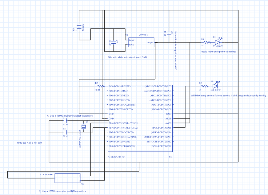| A) 1x 16mHz Ceramic Resonator COM-09420 – No fuss or extra parts. The middle leg goes to ground and the other 2 legs go to Pin 9 and 10. | B) 1x 16Mhz Ceramic Crystal COM-00536 – Used on the Arduino Uno, but requires 2x 22pF Ceramic Capacitors COM-08571 |